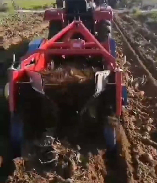 收獲機(jī) 地瓜收獲機(jī)與小四輪拖拉機(jī)傳動(dòng)軸連接,經(jīng)主傳動(dòng)軸上偏心塊、連桿帶動(dòng)挖掘鏟作前后往復(fù)運(yùn)動(dòng),再由傳動(dòng)軸左端齒輪帶動(dòng)過(guò)橋軸上變速齒輪,并改變傳動(dòng)方向,再經(jīng)鏈條帶動(dòng)分離排鏈主傳動(dòng)軸,并由主傳動(dòng)軸兩端偏心塊帶動(dòng)振動(dòng)篩上下抖動(dòng)。在拖拉機(jī)的牽引下,使挖掘鏟挖掘出來(lái)的馬鈴薯(大蒜、地瓜等)鋪放在分離排鏈上,在分離排鏈的轉(zhuǎn)動(dòng)下土落在分離排鏈下方,馬鈴薯(大蒜、地瓜等)和未落下的土塊,在分離排鏈上面落在振動(dòng)篩上,再次清選分離后集中鋪放在機(jī)后地面上。